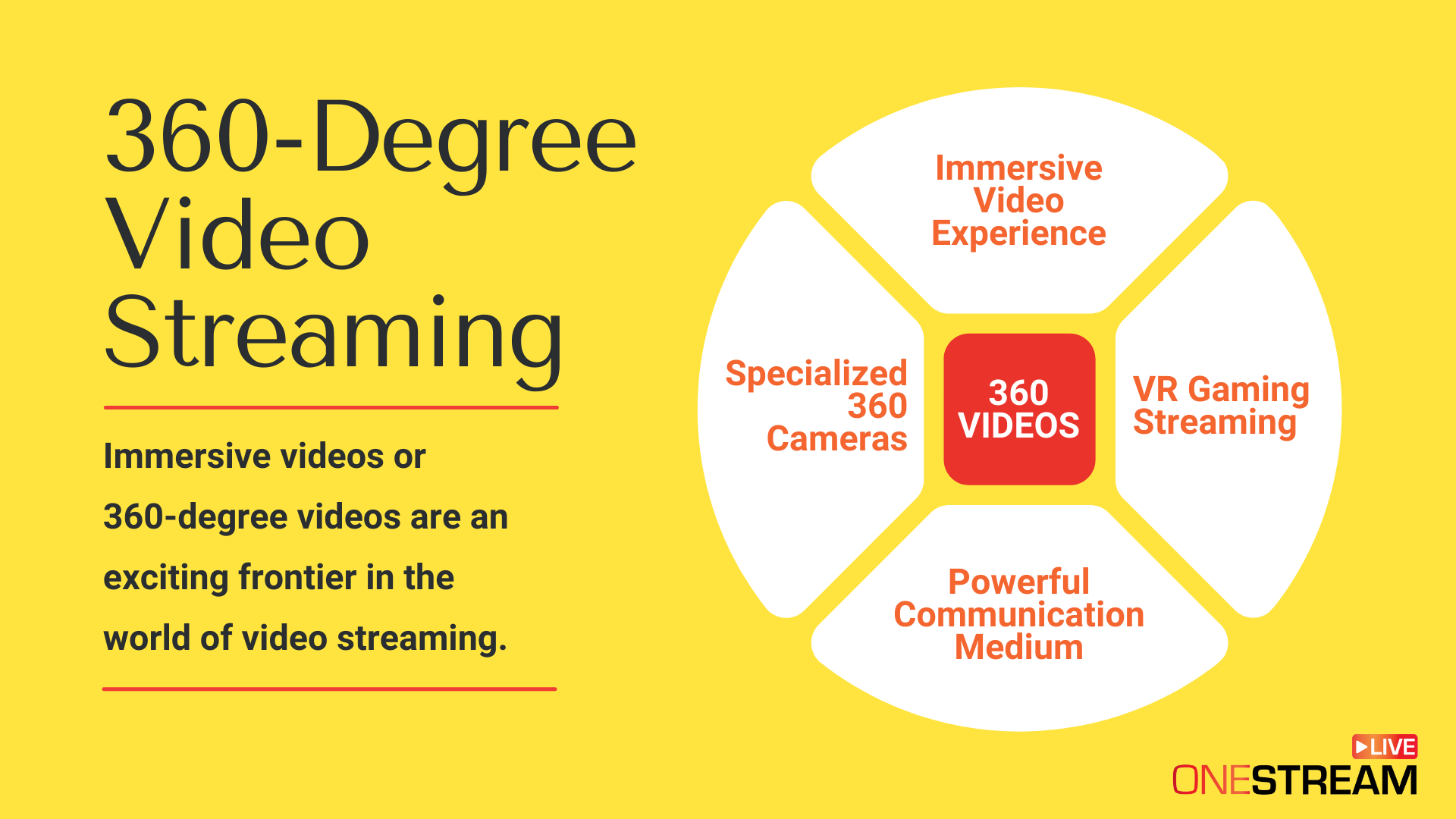 OneStream Live supports 360 live streaming of pre-recorded content on multiple social platforms and will hopefully be available for real-time streaming soon. As computing power escalates and compression algorithms improve efficiency, 360 degree video streaming will become a powerful communication medium in the foreseeable future.