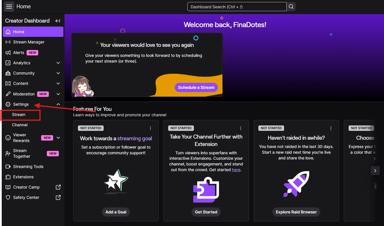 - You need to get your stream key from Twitch by clicking your “profile” icon on the top right and going into “creator dashboard” like this:
