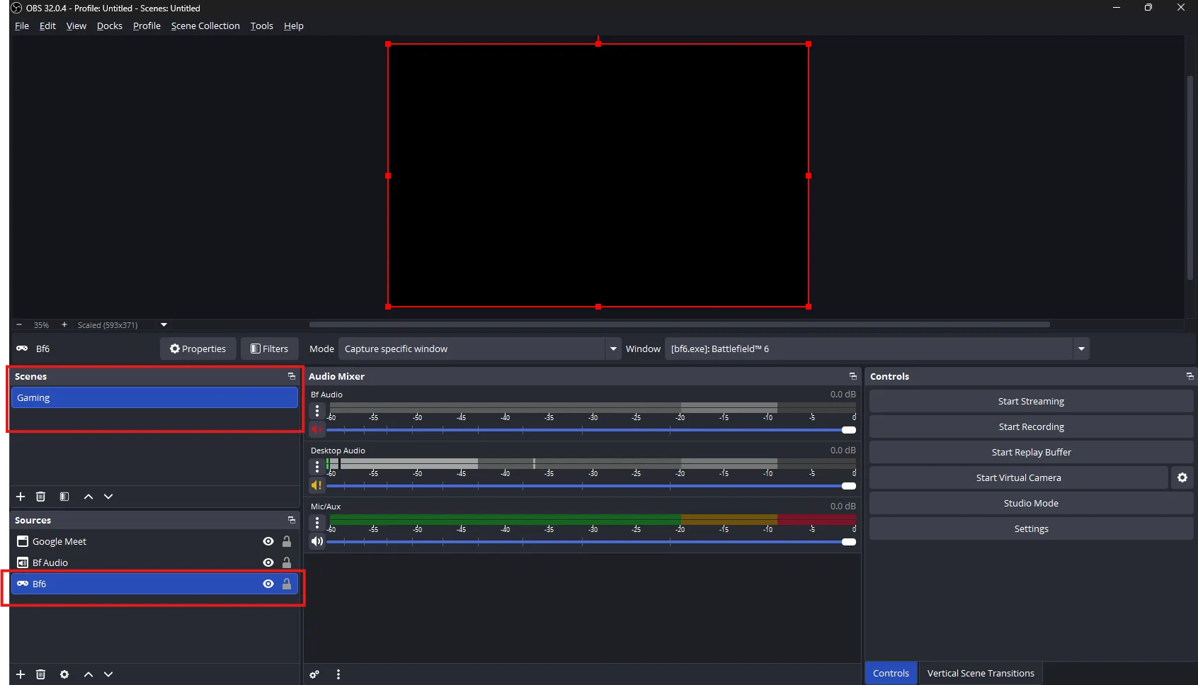 Now, let’s add the game or application in OBS that you want to test on Twitch. In my case, I tested the game “Battlefield 6,” so I created a scene “Gaming” and added the game in the “Sources” like this: