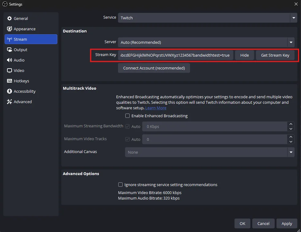 8. Copy this test stream key and paste it into OBS by going into Settings > Stream, like this: