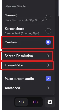 If these don’t fit your desired stream quality, you can also go for custom settings by checking the “Custom” box. Once you do that, you’ll get two more options: “screen resolution” and “frame rate” like this: