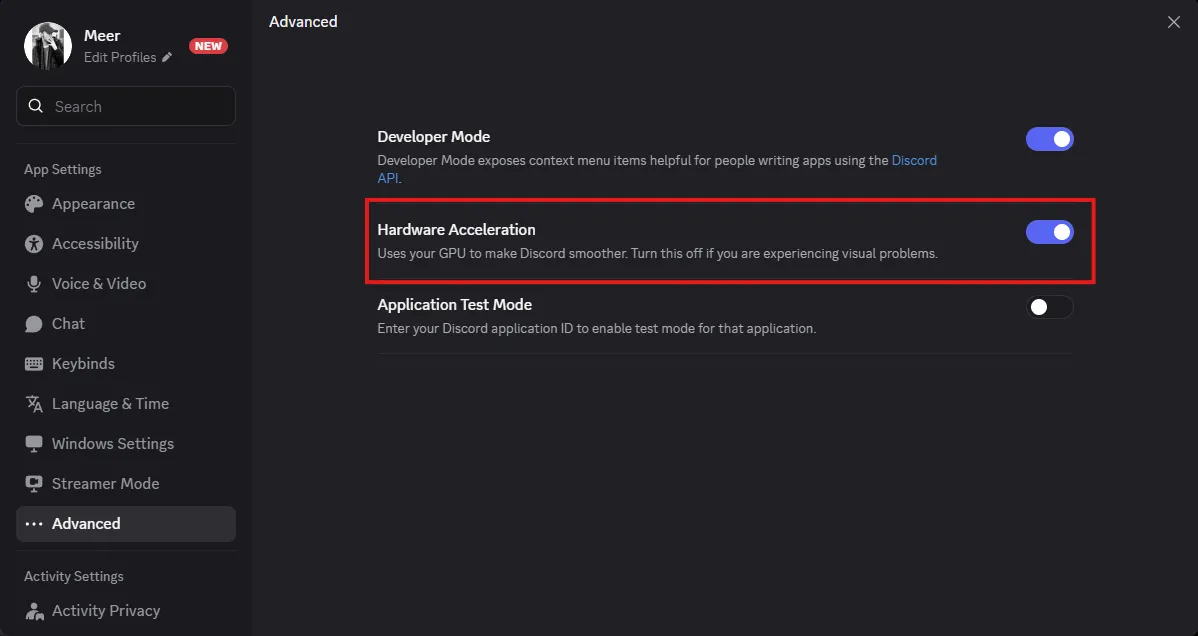3. After this, you’ll see an option to enable “Hardware Acceleration” from here: