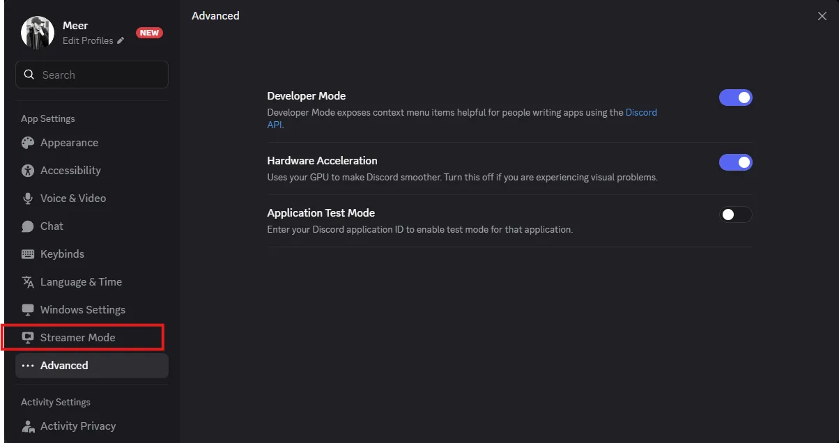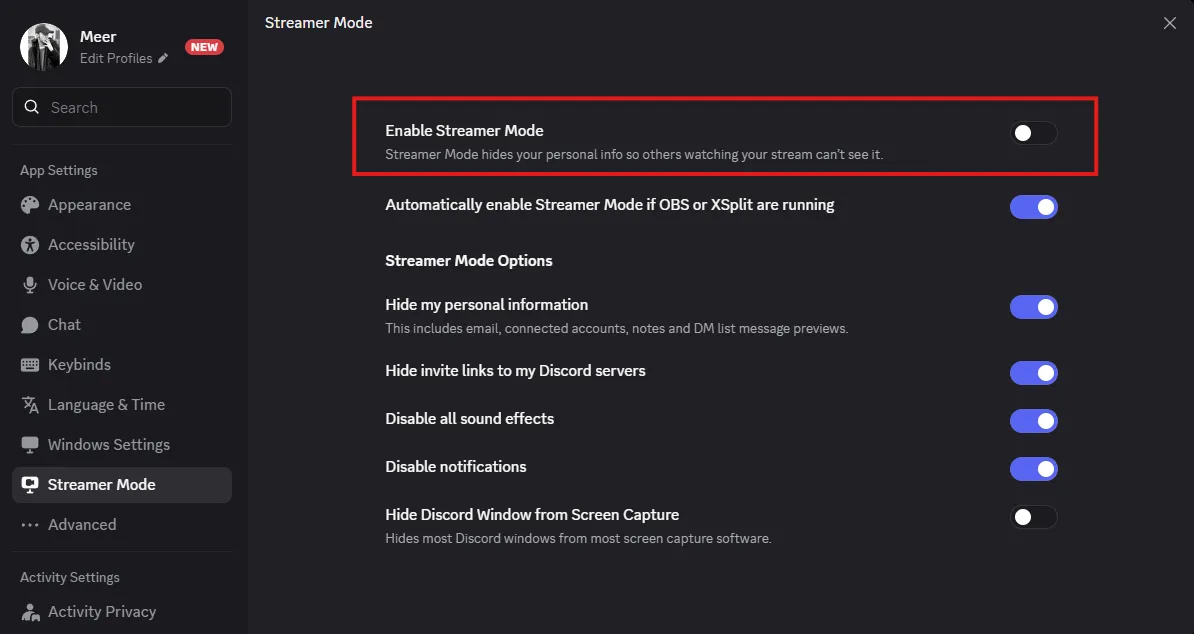 2. Once you click, you’ll get an option to enable “Streamer Mode” from here: