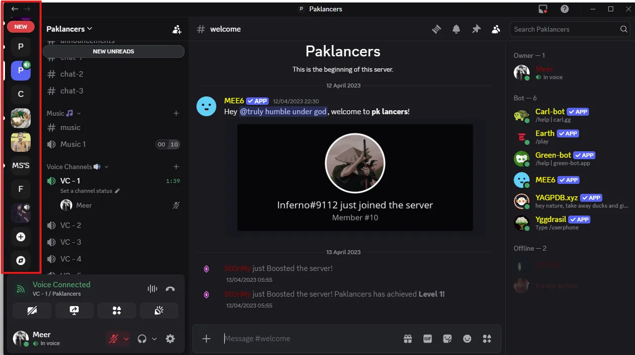 Step 1 – To stream on a server, you need to join a channel by selecting the specific server from the left sidebar, like this: