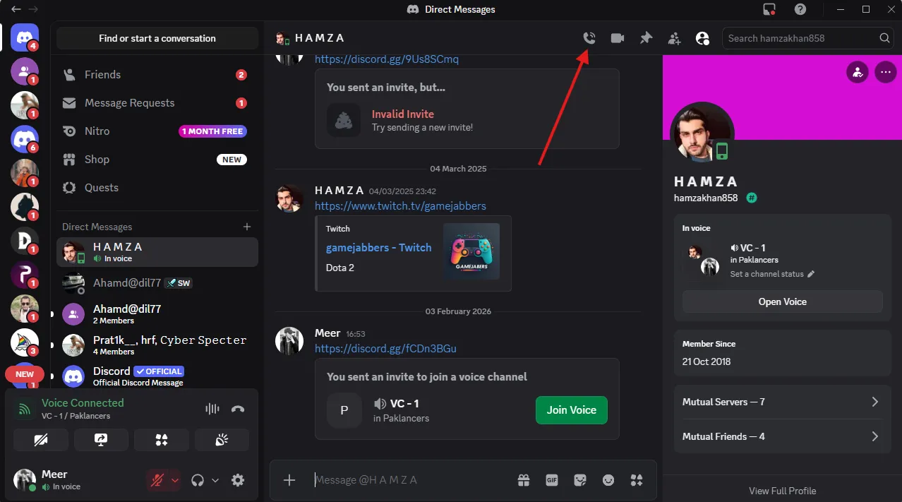 Step 1 – Start a Call: To start a call, you need to find the contact you want to call. You can look for your contact by clicking Direct Messages > Friends.