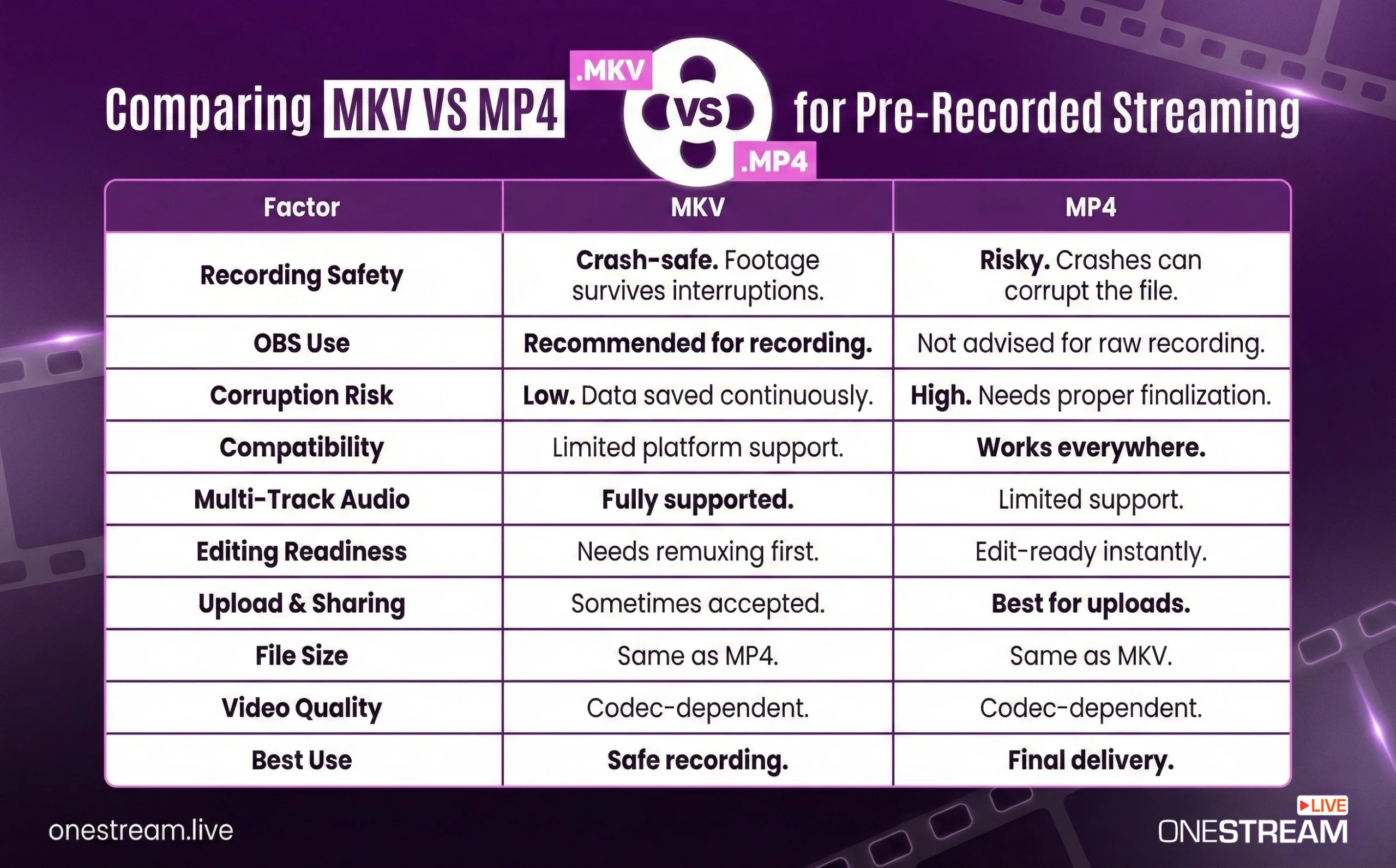 Lost a recording to a crash? This MKV vs MP4 guide explains why OBS creators should record in MKV, then remux to MP4 for uploads.