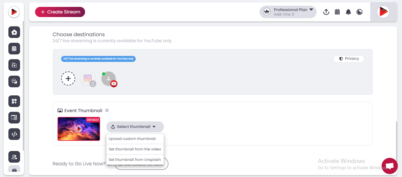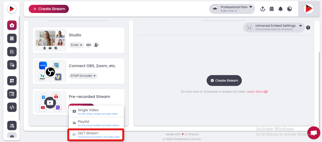 On your dashboard, click “Create Stream” and then choose the “24/7” option to set up a continuous stream.