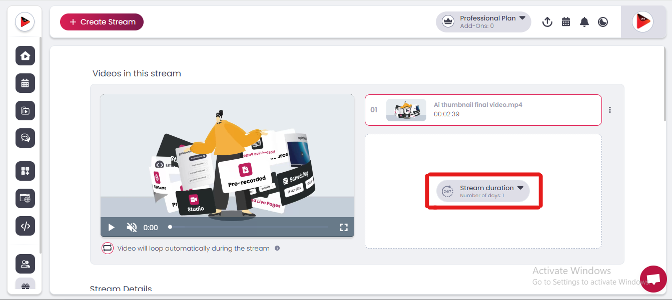 Alternatively, you can hover over the “Add Videos” section under “Pre-recorded video” on your dashboard and click on “24/7 Stream.”