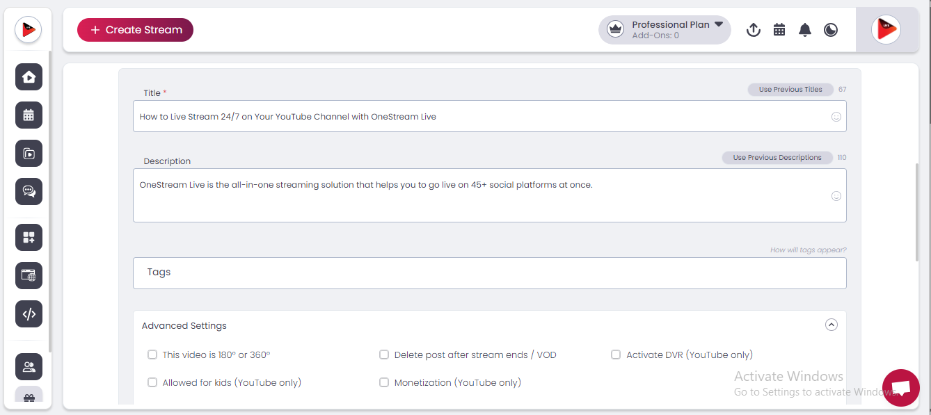 Since OneStream Live currently offers 24/7 live streaming exclusively for YouTube, the following advanced settings are only available for YouTube streams. If you want to enable these options, you can select them based on your stream’s needs: