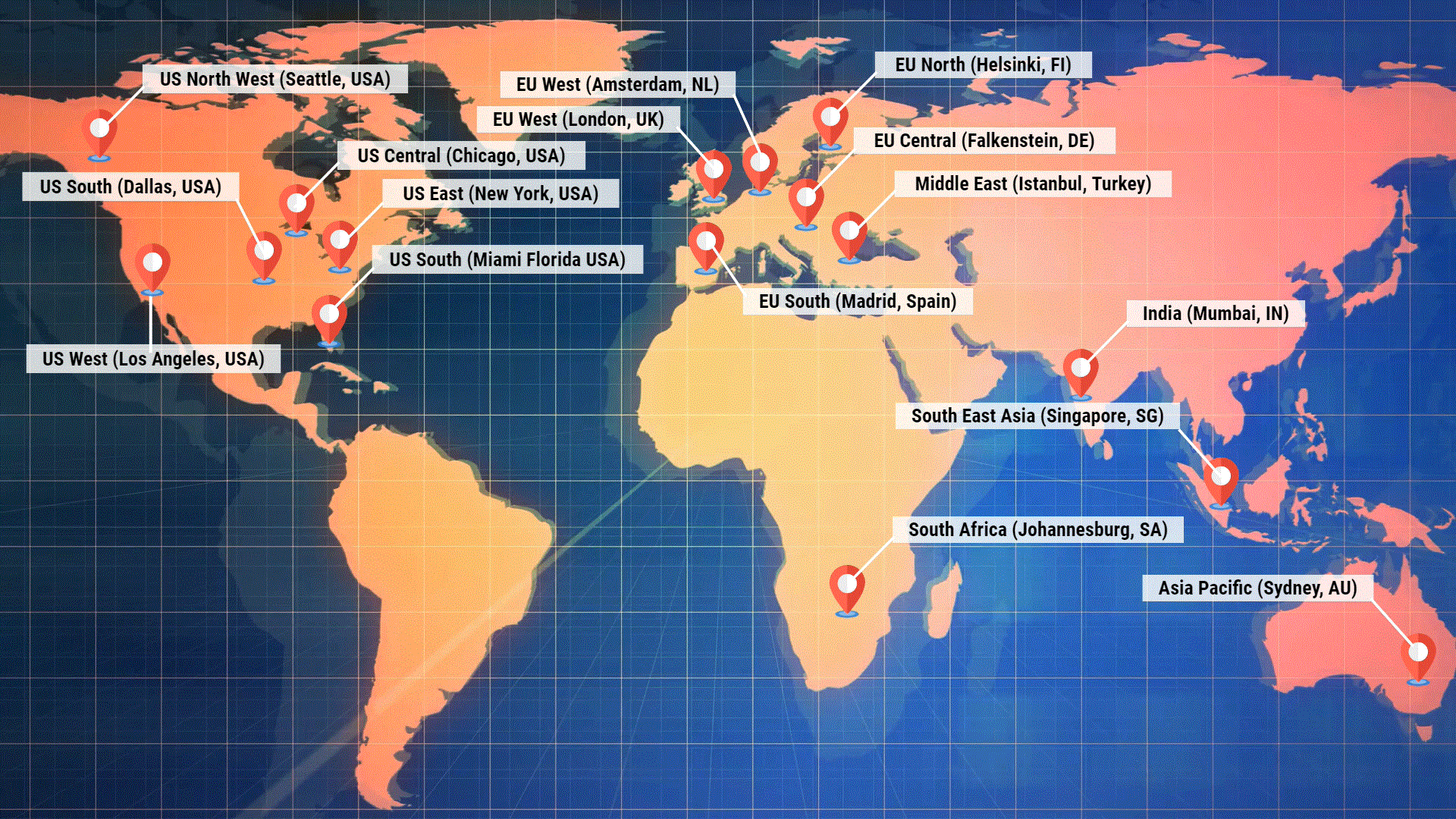 RTMP streaming works best when your encoder connects to the nearest available server. OneStream Live runs servers across multiple continents so you can match your physical location to infrastructure.