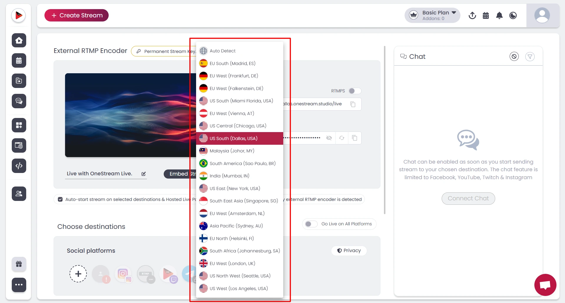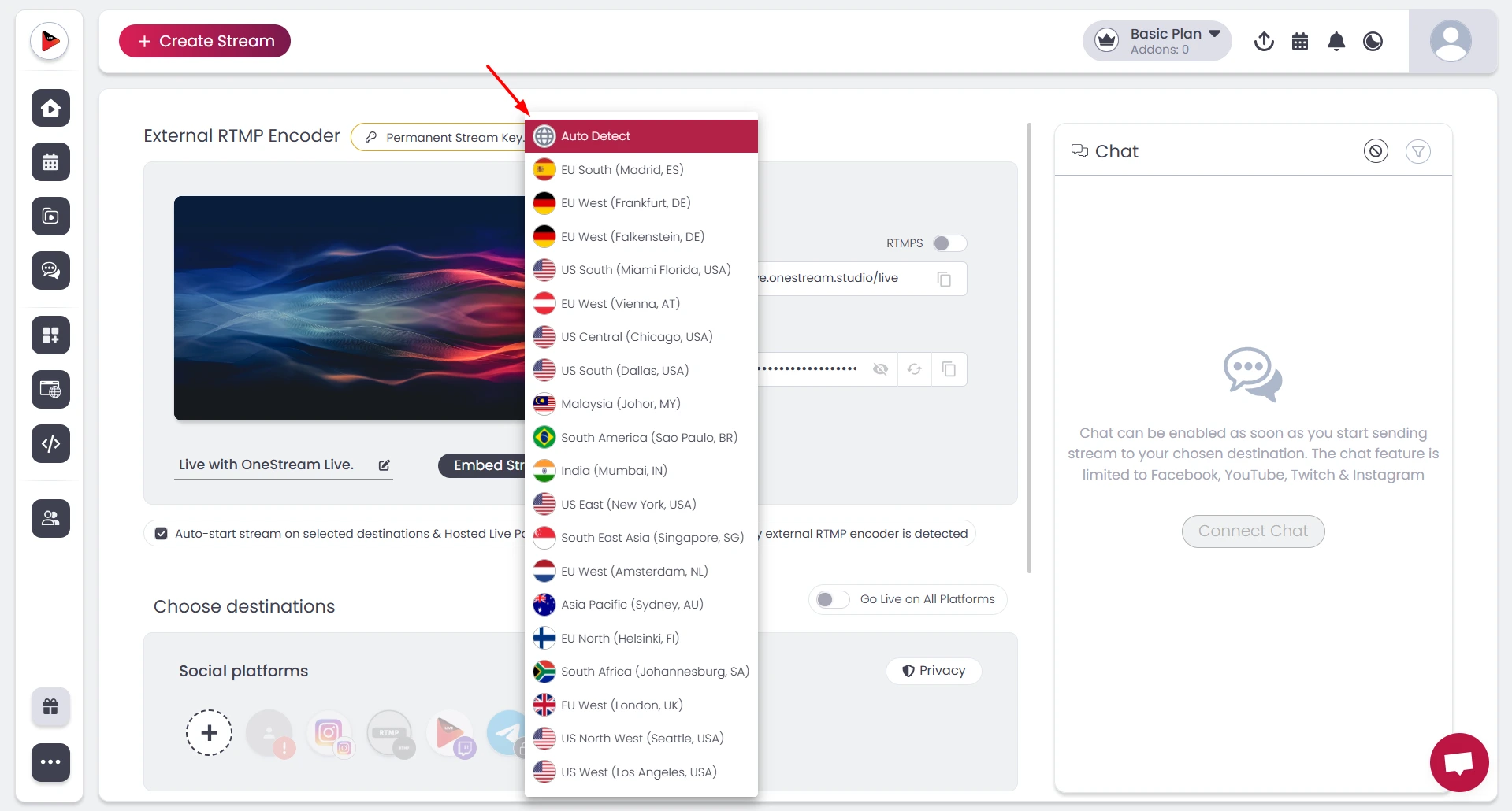 Select the RTMP streaming server geographically closest to your broadcast location. OneStream Live’s Auto Detect feature automatically handles this by reading your IP and routing to the nearest infrastructure.