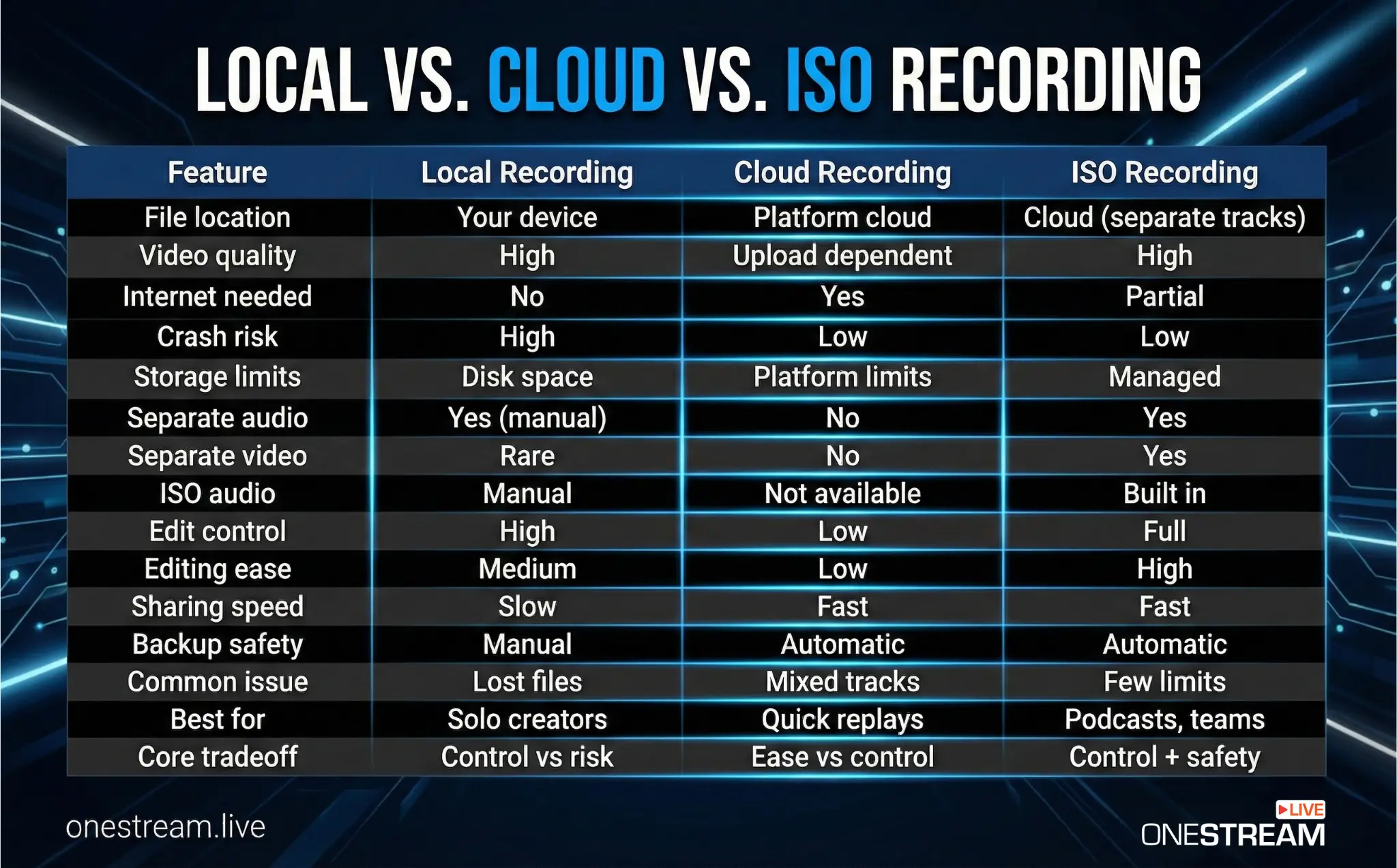 ISO recording (isolated recording) is the secret weapon streamers use to capture pristine content. If you rely on local recording, you control quality but risk crashes, storage limits, and missed tracks. If you rely on cloud recording, you gain convenience but often lose the ability to keep separate audio and video files.