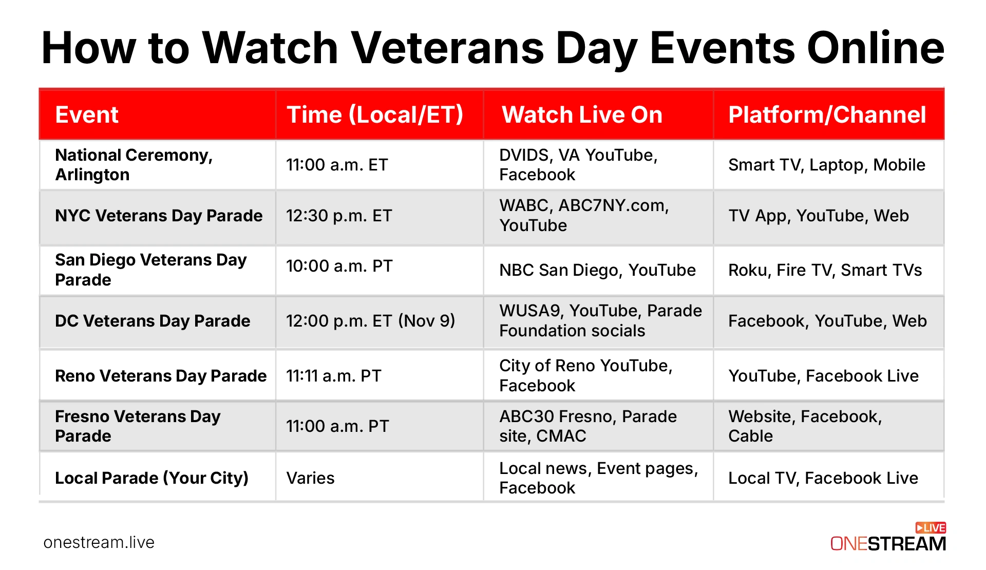 We’ll cover everything from the national Veterans Day ceremony live stream at Arlington to local parades in cities like New York, San Diego, Washington, Reno, and Fresno. Finally, we’ll share device-specific streaming tips (YouTube, Roku, etc.) and a special section for event organizers on how to live stream a parade or ceremony using OneStream Live. Let’s ensure you don’t miss a moment of honoring America’s veterans this November 11.