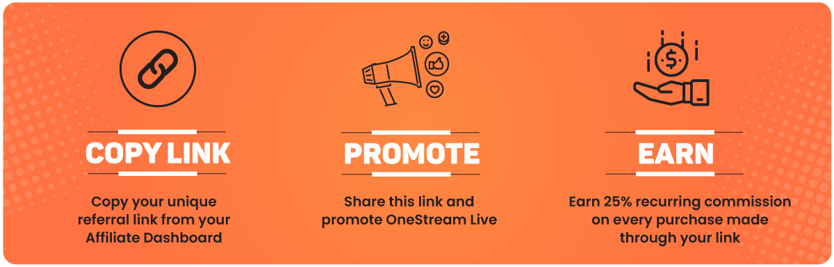 With OneStream Live, considered by many as the best affiliate program, you share our powerful live-streaming solution via your unique referral link and earn a 25% recurring commission every time someone subscribes to a paid plan. It’s the ultimate hack to enjoy the best passive income!